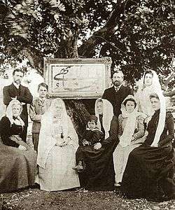 As a young man speculation was rife amongst the Bahá’ís to whom `Abdu'l-Bahá would marry.[5][42] Several young girls were seen as marriage prospects but `Abdu’l-Bahá seemed disinclined to marriage.[5] On 8 March 1873, at the urging of his father,[6][43] the twenty-eight-year-old `Abdu’l-Bahá married Fátimih Nahrí of Isfahán (1847–1938) a twenty-five-year-old from an upper-class family of the city.[44] Her father was Mírzá Muḥammad `Alí Nahrí of Isfahan an eminent Bahá’í with prominent connections.[lower-alpha 2][5][42] Fátimih was brought from Persia to Acre, Palestine after both Bahá’u’lláh and his wife Navváb expressed an interest in her to marry `Abdu’l-Bahá.[5][44][45] After a wearisome journey from Isfahán to Akka she finally arrived accompanied by her brother in 1872.[5][45] The young couple were betrothed for about five months before the marriage itself commenced. In the meantime, Fátimih lived in the home of `Abdu'l-Bahá’s uncle Mírzá Músá. According to her later memoirs, Fátimih fell in love with `Abdu'l-Bahá on seeing him. `Abdu'l-Bahá himself had showed little inkling to marriage until meeting Fátimih;[45] who was entitled Munírih by Bahá’u’lláh.[6] Munírih is a title meaning "Luminous".[46]