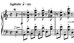 Étude Op. 25, No. 4 in A minor is a technical study composed by Frédéric Chopin. It is marked Agitato at the head. The technique explored in this piece is the performance of off-beat staccato chords set against a regular on-beat bass. This is an example of syncopation. The left hand leaps intervals of up to a tenth (octave plus a third) between the bass and the lowest note of the following chord (and back): this requires a very strong left hand 5th finger. Very often, the performer is required to hold the uppermost note of the right hand in legato while continuing to play the rest of the chord in that hand (and in the left hand) as staccato: this requires a very strong right hand 5th finger. The ending is marked Lento and pianissimo and the chords are all on beat in stark contrast with the rest of the piece.