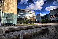 Ørestad is noted for its attractive location and excellent infrastructure, which apart from the metro includes the Oresund Railway and Copenhagen Airport, as well as the nearby Øresund Bridge. The regional Oresundtrains reach Copenhagen Airport in six minutes, Copenhagen Central Station in seven, and 29 minutes to Central Station in Malmö, Sweden's third largest city. Ørestad has once been referred to as "the largest crossroad in Scandinavia".[3] However, Ørestad has also been critizised heavily for its modernist planning approach, focusing exclusively on real estate development and infrastructure connections. This has resulted in wide, open spaces that are void of any human life. The plans for the area have been remade several times to account for such mistakes, but so far without much success.[2]