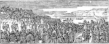 In 1107[1] or 1108,[3] after years of preparations, Sigurd sailed with a large fleet on a crusade to the Holy Land, the first European king ever to do so. Sigurd arrived back in Norway in 1111.[3] Eystein, on the other hand, did not engage in any warfare, and considerably less information is thus written about him than about Sigurd, although Snorri notes that he "had also effected much in the country that was useful while King Sigurd was on his journey."[6] While Sigurd gained fame in posterity as the "warrior king", although mainly because of his one-time crusade,[7] Eystein was portrayed by the saga writers as the "peace king" who stayed at home and improved the country.[2] Since Sigurd remained king for nineteen years after his crusade with little controversy, historian Claus Krag has considered that the domestic peace probably could be attributed equally to Sigurd.[8] In order to contrast Eystein with Sigurd, Snorri tells a story that Eystein instead subdued Jämtland to the Norwegian crown peacefully through the use of gifts and diplomacy. Despite Snorri's account, historical records indicate that Jämtland did not succumb to Norwegian rule until much later, during the reign of King Sverre in 1178.[2] Eystein and Sigurd are, however, known to have claimed monopoly on the trade and taxation in Finnmarken.[9]