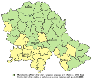 Hungarian is the official language of Hungary, and thus an official language of the European Union. Hungarian is also one of the official languages of Vojvodina and an official language of three municipalities in Slovenia: Hodoš, Dobrovnik and Lendava, along with Slovene. Hungarian is officially recognized as a minority or regional language in Austria, Croatia, Romania, Zakarpattia in Ukraine, and Slovakia. In Romania it is a recognized minority language used at local level in communes, towns and municipalities with an ethnic Hungarian population of over 20%.