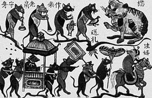 Because Đông Hồ paintings are mainly bought and displayed on the occasion of Tết (Lunar New Year celebration), contents are often humorous and optimistic with bright and powerful colours such as red, yellow, and white.[3] The most popular and best-selling paintings are Lợn đàn, Gà đàn, and Chăn trâu thổi sáo, which represent the wish for prosperity, happiness and luck in the New Year.[3][4] Together with the illustration, a Đông Hồ painting also has some Hán tự to literally describe the meaning. Sometimes, Đông Hồ paintings are shown in couplet or quartet to fully express the signification of the set, for example the Vinh hoa (eminence) and the Phú quý (prosperity and honour) should be taken in couple.[1] In addition, Đông Hồ paintings are a medium to express the social concern of craftsmen through subtle social, political, and cultural criticism. For example, before World War I, Đông Hồ villagers produced a set of four prints entitled Văn minh tiến bộ (The Progress of Civilization) in which the Westernization of the Vietnamese society was delicately criticized through the satirical portrayal of contemporary Vietnamese people dressing and behaving like French people.[5] Some Đông Hồ paintings became famous for their interesting themes like the picture Đám cưới chuột (Rat's wedding) which features a wedding march of rats with the rat bride and groom and other rat guests delivering gifts to a big cat in hope that the cat will leave the happy "couple" alone.