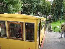 Žaliakalnis Funicular Railway is a funicular railway in Kaunas, Lithuania. Built in 1931, it is the oldest funicular in Lithuania. The funicular is made of a wood-paneled coachwork and climbs 142 metres (466 ft) up from behind the Vytautas the Great War Museum to the Basilica of the Resurrection.