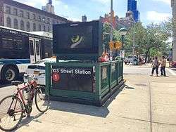 103rd Street is a local station on the IRT Broadway–Seventh Avenue Line of the New York City Subway. Located at the intersection of 103rd Street and Broadway on the Upper West Side of Manhattan, within Manhattan Valley, it is served by the 1 train at all times.