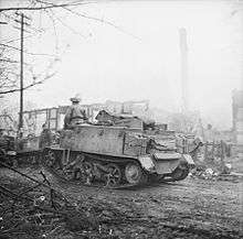 The 11th Armoured Division was held in reserve until 28 March 1945[12] when it crossed the Rhine at Wesel, heading for the river Weser. Despite sporadic pockets of resistance, it reached Gescher on the evening of 30 March. During the next few weeks the Division worked closely with the British 6th Airborne Division, both of which were under command of Lieutenant-General Evelyn Barker's VIII Corps.[13] 3 RTR arrived at the river Ems in Emsdetten; they then reached the Dortmund-Ems canal the following day.[14]