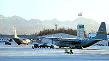 A C-130 Hercules transport aircraft from the Alaska Air National Guard's 144th Airlift Squadron takes off from Bagram Airfield, Afghanistan | |