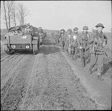 Universal Carriers and infantry of the 2nd Battalion, Gordon Highlanders move up to cross the Elbe, 29 April 1945.