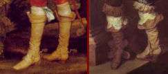 Stockings had elaborate clocks or embroidery at the ankles early in the period. Boothose of stout linen were worn under boots to protect fine knitted stockings; these could be trimmed with lace.