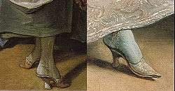 The shoe of the previous period with its curved heel, squarish toe, and tie over the instep gave way in the second decade of the 18th century to a shoe with a high, curved heel. Backless mules were worn indoors and out (but not on the street). Toes were now pointed. This style of shoe would remain popular well into the next period. Shoes at the time had many variations of decoration, some even included metal wrapped threads.[6]