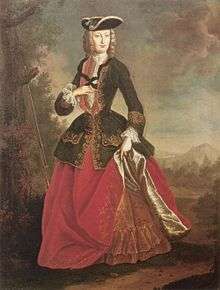 - Luisa Ulrika of Prussia, Queen of Sweden wears a gown with "split sleeves" (elbow frills and a lower sleeve tight to the wrist). Her overskirt is looped up over her petticoat and she wears a black cap set with diamond studs. Her choker necklace is set with a diamond-studded bow, 1744.