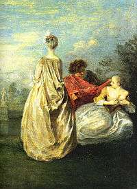 The robe à la française or sack-back gown was looser-fitting and a welcome change for women used to wearing bodices.[1] With flowing pleats from the shoulders was originally an undress fashion. At its most informal, this gown was unfitted both front and back and called a sacque. With a more relaxed style came a shift away from heavy fabrics, such as satin and velvet, to Indian cotton, silks and damasks. Also, these gowns were often made in lighter pastel shades that gave off a warm, graceful and childlike appearance.[2] Later, for formal wear, the front was fitted to the body by means of a tightly-laced underbodice, while the back fell in loose box pleats called "Watteau pleats" from their appearance in the paintings of Antoine Watteau.