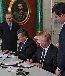 The 17 December 2013 Ukrainian–Russian action plan is a de facto defunct[1][2] treaty between the President of Ukraine Viktor Yanukovych and Russian President Vladimir Putin on 17 December 2013 whereby it was agreed that Russia would buy $15 billion of Ukrainian Eurobonds and that the cost of Russian natural gas supplied to Ukraine would be lowered to $268 per 1,000 cubic metres (the price was more than $400 at the time).[3][4] The deal relinquished Crimea's Kerch peninsula to the Russian Navy, granting Russia highly desirable warm-water ports and strategic access to the Mediterranean and beyond.[5][6] The treaty was signed amid massive, ongoing protests in Ukraine for closer ties between Ukraine and the European Union.[7] The interest rate on the loan would be renegotiated every three months, based on a verbal agreement between the two leaders.[5]