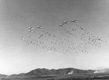 In April 1949, the regiment returned to the United States and was stationed at what was then Camp Campbell, Kentucky.[3]:140 It was redesignated the 187th Airborne Infantry Regiment on 30 June 1949 and became part of the 11th Airborne Division.[2] In early 1950, the 187th participated in "Operation Swarmer," the largest peacetime airborne maneuver in history.
