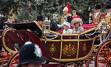 The 1902 State Landau is a landau open-topped horse-drawn carriage owned by the United Kingdom for royal use within Britain. It is one of the several landau carriages used by the royal family. It was built in 1902 for the coronation of King Edward VII and Queen Alexandra,[1] and nowadays is most often seen during State visits conveying Elizabeth II and the visiting head of state to Buckingham Palace (or Windsor Castle) at the head of a procession of carriages.