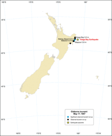 The 1947 Gisborne earthquakes and tsunami occurred east of Gisborne, offshore New Zealand's North Island. Both earthquakes are estimated to have measured at most 7.1 on the Moment Magnitude scale.[1] The first earthquake, which struck offshore Poverty Bay on 26 March is estimated to have been between 7–7.1MW, and generated a tsunami with a maximum measured run up height of 10 meters. The tsunami caused widespread damage along the north-east coast of the North Island, but was not observed outside of New Zealand.[1] Seven weeks later, a second earthquake struck offshore Tolaga Bay on 17 May, and was estimated to have been between 6.9–7.1MW. It also generated a tsunami, with a maximum measured run up height of 6 meters. Despite occurring at low tide and being less powerful the second time around, the tsunami caused small amounts of damage along the east coast and is noted for washing away construction materials ironically being used to repair damage from the previous tsunami.[1] No one died in either of the 1947 tsunamis, but the toll could have been high had they struck during summer holidays, when the beaches are crowded.[2]