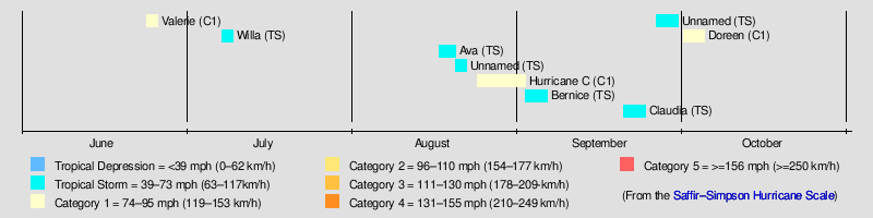 The first of two hurricane landfalls, Hurricane Valerie, struck northwestern Mexico in June. The other, Hurricane Doreen, hit further to the north of Valerie in October. The most impacting storm of the season was Tropical Storm Claudia, after its remnants dropped heavy rainfall in portions of Arizona. The rainfall left damaging flooding across rivers and towns. No people were killed, but damage totaled to $11 million (1962 USD). Moreover, Tropical Storm Bernie also made landfall along the Baja California peninsula, later providing rain to Arizona. An unusually high number of storms threatened the Palmyra Atoll, where only 1% of known Pacific tropical cyclones have threatened. In all, a total of 16 storms were observed, which was above average though only two (Valerie and Doreen) reached hurricane intensity.