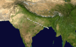 Under the influence of the ongoing onset of the southwest monsoon, a trough of low pressure developed over the Arabian Sea off the coast of Karnataka on June 6. It slowly moved northwards, and consolidated into a depression by the morning of June 9. The next morning, while the storm was moving northwestwards, the India Meteorological Department upgraded it to a Cyclonic Storm. Over the following days the storm intensified further into a very severe cyclonic storm, recurved northeastwards and crossed the coast of Gujarat near Naliya at a peak intensity of 969 hPa (28.61 inHg). The system rapidly degenerated inland and dissipated into a low pressure area on June 13. 27 deaths were reported due to the cyclone in India.[4] Prolonged rains associated with the system triggered severe flooding in Pakistan that killed 450 people. Approximately 400,000 were affected by the floods and damage amounted to $4.1 million.[5]
