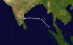 On December 15, an area of low pressure was identified over the southern Andaman Sea. Remaining nearly stationary,[20] it gradually developed into a depression two days later.[21] Despite being at a low latitude of 5°N, favorable conditions allowed the system to steadily strengthen, attaining hurricane-force winds by December 19.[20] Spanning approximately 965 km (600 mi), the cyclone reached its peak intensity on December 21 as it approached Ceylon.[21] Based on satellite imagery, it was estimated that the storm had peak winds of 240 km/h (150 mph), with gusts as high as 280 km/h (175 mph).[21] This ranked the system as a modern-day super cyclonic storm.[22] Weakening somewhat, the system continued westward, moving over Tamil Nadu, before rapidly weakening. The system degenerated into a remnant low after emerging over the Arabian Sea on December 24 and dissipated two days later.[20]