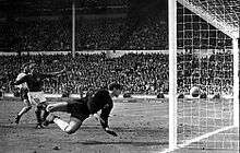 Germany pressed for an equaliser in the closing moments, and in the 89th minute Jack Charlton conceded a free kick for climbing on Uwe Seeler as they both went up for a header.[5] The kick was taken by Lothar Emmerich, who struck it into George Cohen in the wall; the rebound fell to Held, who shot across the face of goal and into the body of Karl-Heinz Schnellinger. The ball deflected across the England six-yard box, wrong-footing the England defence and allowing Wolfgang Weber to level the score at 2–2 and force the match into extra time. Banks protested that the ball had struck Schnellinger on the arm, and reiterated the claim in his 2002 autobiography,[6] but replays showed that it actually struck Schnellinger on the back.[5][7]