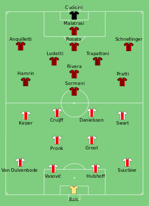 The 1969 European Cup Final was a football match held at the Santiago Bernabéu, Madrid, on 28 May 1969, that saw Milan of Italy play against Ajax of the Netherlands to determine who would be the champions of Europe that season. Ajax made history by becoming the first Dutch side to reach the final, but they were beaten by their Italian opponents 4-1.