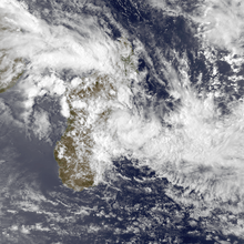 The ITCZ remained active in early March, spawning a tropical depression in the northern Mozambique Channel on March 2. It failed to organize at first, although an increase in convection on March 3 allowed the system to strengthen into Tropical Storm Ionia.[4] That day, it attained peak winds of 65 km/h (40 mph).[16] After passing about 50 km (30 mi) north of Juan de Nova island, Ionia progressed southeastward and approached the western Madagascar coastline. The circulation paralleled the coast for about 250 km (160 mi) before moving ashore at Belo on March 4. The storm weakened over land, re-emerging over open waters on March 5 from southeastern Madagascar. Ionia briefly re-intensified into a tropical depression that night,[4] but it lost tropical characteristics on March 7.[16] The remnants persisted several more days until dissipating south of the Mascarene Islands on March 11.[4]