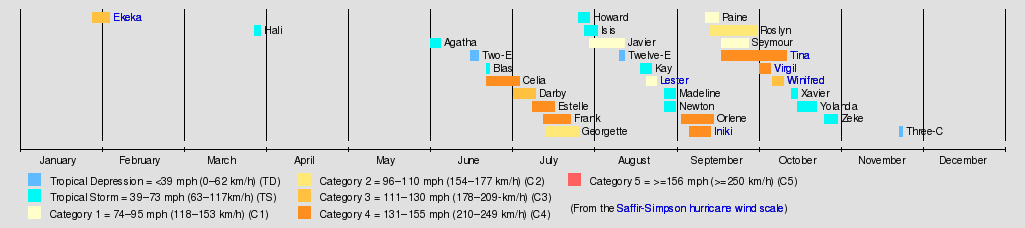 The season officially started on May 15, 1992 in the Eastern Pacific, and on June 1, 1992 in the central Pacific, and lasted until November 30, 1992. These dates conventionally delimit the period of each year when most tropical cyclones form in the northeastern and north-central Pacific Ocean. However, the season wildly exceeded these bounds, as climatological effects including an El Niño caused Hurricane Ekeka to form on January 26. It is also the only known time that multiple cyclones had formed before the season began.[1]