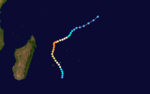 The ITCZ spawned a tropical disturbance on January 19 just west of St. Brandon, and within a day intensified into Tropical Storm Gretelle. With a large ridge to the southeast, the storm moved southwestward and gradually intensified, becoming a tropical cyclone on January 22. Around that time, the storm passed about 300 km (190 mi) northwest of Réunion. Early on January 23, the MFR estimated peak 10–minute winds of 140 km/h (85 mph), while JTWC estimated 1–minute winds of 215 km/h (130 mph) the next day. While near peak intensity, Gretelle made landfall on southeastern Madagascar near Farafangana,[1][16] the first cyclone to hit the region in 41 years.[17] Gretelle rapidly weakened into a tropical depression over land, but gradually re-intensified into a moderate tropical storm in the Mozambique Channel. A trough turned the storm to the southeast on January 28, and three days later the storm dissipated south-southwest of Madagascar.[16][1]