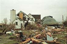 As the tornado continued through St. Peter it caused more damage and destruction. St. Peter's Catholic Church and St. Peter Evangelical Lutheran Church were destroyed, as was the Arts and Heritage Center.[24] The hospital was severely damaged and the library was hit, resulting in a loss of 25% of its books.[25] Officials estimated 500 homes in St. Peter were destroyed, 1700 more were damaged and over 17,000 trees were lost.[21][26] Many of the homes and trees that were destroyed in St. Peter were more than a century old. Debris from St. Peter that was sucked into the tornado fell back down to earth as far as Rice Lake, Wisconsin, over 130 miles (209 km) away.[10] In addition to the damage in St. Peter, the tornado also damaged or destroyed 60 homes and caused $6.5 million in damage in rural areas.[25] All together this tornado was on the ground for 18 miles (29 km) and inflicted $120 million in damage.[25]