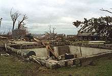 At approximately 4:30 pm the twister, which witnesses described as a "mass of blowing dust" or "rolling fog bank"[10] entered Comfrey, a town of 550 people located in both Cottonwood and Brown Counties. Comfrey's fire chief saw the tornado while storm spotting and ordered the town's sirens activated.[14] The tornado moved through the center of Comfrey one minute after the sirens went off, and destroyed a grain elevator, the town hall, three of the town's four churches, the grocery store, and most of the main street businesses downtown.[15][16] The town's firehouse collapsed, and the school was heavily damaged. Of the 200 houses in the town, all but 15 suffered damage. Fifty of those homes were destroyed and as a result 100 people were left homeless.[15][16] Approximately 75% of the buildings in Comfrey were damaged or destroyed.[15][17]