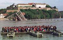 People crossing Danube after destruction of all three bridges in Novi Sad