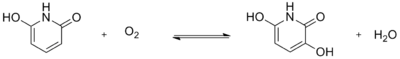 Another reaction of 2,6-dihydroxypyridine highlights its function as a substrate for oxygenase. One example is the enzyme monooxygenase, which oxidizes the substrate by transferring one oxygen atom of O2 to the substrate. The other oxygen atom is reduced to water. The product of the oxidase reaction was determined to be 2,3,6-tri-hydroxypyridine because of the results of the stoichiometry as well as the results of the ultraviolet spectrum. This reaction can be shown by the following equation: