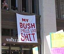 Throughout the convention, there were several protesters who were able to sneak into Madison Square Garden and disrupt the speakers at the podium. Some even described it as surprisingly easy.[25] Anti-war activists from CODEPINK disrupted primetime addresses three nights in a row and twice during George W. Bush's acceptance speech.[26][27][28] The father of one of the first U.S. servicemen killed in Iraq was ejected after holding up a sign that read "Bush Lied. My Son Died."[29][30]