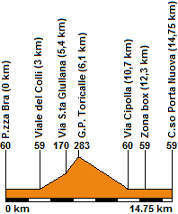 The women's road race of the 2004 UCI Road World Championships cycling event took place on 2 October in Verona, Italy. Starting at 13:30 CEST, the race was 132.75 km long, which constituted of 9 laps of a circuit around Torricelle, including the 3.4 km Torricelle climb, with an average gradient of approximately 4%, 7% at the steepest point.[1] The course was almost identical to the one used for the 1999 UCI Road World Championships when Edita Pučinskaitė won the women's championship.[2]