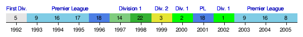Prior to this season, the history of Manchester City's performance in the English football league hierarchy since the creation of the Premier League in 1992 is summarised by the following timeline chart – which commences with the last season (1991–92) of the old Football League First Division (from which the Premier League was formed).