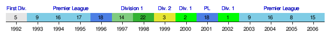 Prior to this season, the history of Manchester City's performance in the English football league hierarchy since the creation of the Premier League in 1992 is summarised by the following timeline chart – which commences with the last season (1991–92) of the old Football League First Division (from which the Premier League was formed).