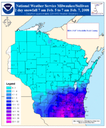 - 1 2 NWS Milwaukee/Sullivan (February 11, 2008). "February 5–6, 2008 Major Winter Storm Southern Wisconsin". National Weather Service. Retrieved 2008-04-26.