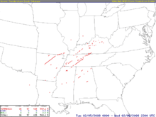 A total of 57 people were killed across four states and 18 counties, with hundreds of others injured.[4] The outbreak, at the time, was the deadliest in the era of modern NEXRAD doppler radar, which was fully implemented in 1997.[5] The event was the second deadliest in February since 1950 behind the February 1971 Mississippi Valley tornado outbreak, which killed 123,[6] the deadliest outbreak in both Tennessee and Kentucky since the 1974 Super Outbreak,[7] and was at the time the deadliest tornado outbreak in the US overall since the 1985 United States–Canada tornado outbreak which killed 90 people.[8] This record would not be surpassed until the 2011 Super Outbreak which killed 324 people. Damage from tornadoes was estimated at over $500 million (2008 USD).[9]