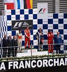 The 2009 Belgian Grand Prix (formally the LXV ING Belgian Grand Prix) was a Formula One motor race held on 30 August 2009 at the Circuit de Spa-Francorchamps near the town of Spa, Belgium. It was the 12th race of the 2009 Formula One season. The race was contested over 44 laps, with an overall race distance of 308.2 km (191.5 mi). The race was won by 2007 world champion Kimi Räikkönen of Ferrari after starting from sixth on the grid.[1] Giancarlo Fisichella of Force India came second after starting from the team's first pole position. Sebastian Vettel came third after starting from eighth on the grid.