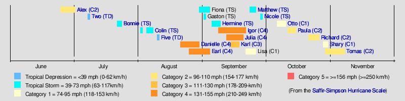 The season began with Hurricane Alex, a Category 2 storm on the Saffir–Simpson Hurricane Scale, which struck the Yucatán Peninsula as a tropical storm and northeastern Mexico south of the Texas border at peak intensity. Following Alex, a series of relatively weak systems occurred into the month of July and early August. In the latter part of August and September, the season became much more active with the formation of eleven named storms in about 40 days, six of which were Cape Verde-type storms. Four of those Cape Verde storms (Danielle, Earl, Igor, and Julia) each reached Category 4 intensity and a fifth in the Bay of Campeche (Karl) also became a major hurricane. Danielle and Earl were back-to-back major hurricanes, followed by several weak tropical storms, and then another series of three consecutive major hurricanes. From August 21 to September 26, there was not a single full day without at least one tropical cyclone active for a total of 36 days, starting with the formation of Tropical Depression Six (which became Hurricane Danielle) and ending with the dissipation of Tropical Storm Matthew, the longest period since the 2005 Atlantic hurricane season. In the month of September, eight named storms formed, which is the highest ever recorded, tying with the 2002 and 2007 seasons.
