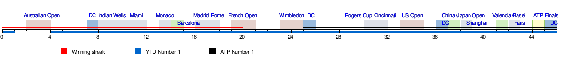 The 2011 Novak Djokovic tennis season is widely regarded as one of the greatest seasons ever in men's tennis.[5] He ended the year with 10-1 record against Rafael Nadal and Roger Federer. He remained undefeated until the French Open semifinals in June, compiling a 41-match winning streak. Djokovic won ten tournaments, three of them Grand Slam events: the Australian Open, Wimbledon Championships and the US Open.[5] He won a then record five Masters Series 1000 titles: Indian Wells, Miami and Canada, played on hard courts, and Madrid and Rome, on clay.[6] Djokovic also won in Dubai and at the Serbia Open.
