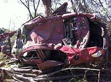 The tornado then crossed the Mulberry Fork for the fourth time and moved into Cullman County. South of Arkadelphia, a second area of EF4 damage was observed, as a cinder block construction home was leveled and a car was thrown 130 yards (120 m). Nearby, an underground storm shelter collapsed onto the occupants sheltering inside as the tornado passed overhead.[96] The tornado then crossed the Mulberry Fork again, moving into Blount County, where it crossed Interstate 65, before crossing the Mulberry Fork into Cullman County southwest of Garden City. It quickly crossed the river again (the seventh crossing), moving back into Blount County. As it continued to the south-southwest of Garden City, it straddled the Mulberry Fork before finally moving solidly into Blount County and toward Blountsville. On the southeast side of Blountsville, the tornado caused high-end EF2 damage to multiple well-built brick and slab foundation homes, one of which had some exterior walls collapse. The storm continued to the northeast and out of Blountsville, where two additional homes sustained high-end EF3 damage. A large portion of one of the homes was wiped off of its foundation; however, its garage sustained only minor roof damage. At the second of these two homes, a dump truck was thrown 30 feet (9.1 m).[96] The tornado then moved into Marshall County, causing significant damage to a house and completely destroying an industrial plant at EF2 strength. The tornado then moved into a wooded area, weakened, and eventually lifted south-southwest of Guntersville at 5:56 p.m. CDT (2256 UTC). Thousands of trees were downed along the tornado's path.[97]