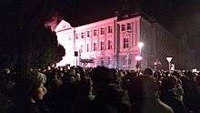 The third protest occurred on 26 November 2012, starting at 16:30 CET, when about 10,000 people gathered on the Liberty square (Trg svobode). Demonstrations started peacefully, with protesters chanting slogans against Kangler and setting ablaze his pictures, a life-size model of the mayor and a cardboard model of one of the speed radars.[60][61] However, about two hours into the protests they turned violent when a group of several thousand decided to move in front of a building, the seat of the City Municipality of Maribor, located about 200 meters to the north of the square, which was heavily protected by the police forces.[8][11]
