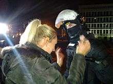 Even during the protests reports were made, by the reporters covering the event live, that the police had exceeded their authority and used excessive force.[60] The protest was non-violent and escalated only after the police threw tear gas into the peaceful crowd and decided to disperse the crowd by force.[12][13][17] YouTube videos emerged, showing the excessive force used by the police officers.[12][13][17] One of the videos even shows how peaceful sitting protesters are being sprayed with tear gas in order to forcibly disperse.[12][13][17][63] Some reporters described the events as police brutality and unprecedented in the history of Slovenia, since its independence in 1991, stating how the police did not use such measures against its own people even during the period of socialist Yugoslavia.[61]