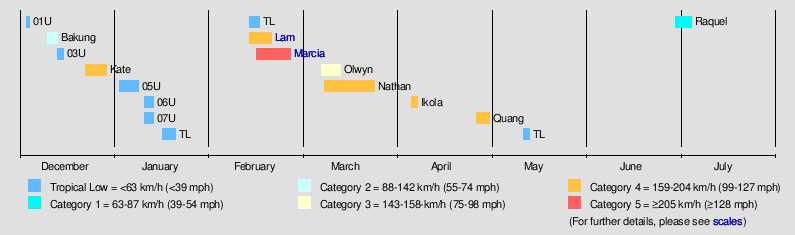 | 17 systems | 3 December – 5 July | 205 km/h (125 mph) | 930 hPa (27.46 inHg) | $933 million | $732 million | 1 | |||