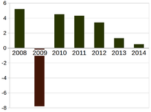 On 16 December 2014, the RTS Index, denominated in U.S. dollars, declined 12%, the most on any given day since the midst of the global financial crisis in November 2008, and the Micex index declined 8.1% at one point before ending the day higher. This increased the decline of RTS Index, up until 16 December, of nearly 30% during the month of December.[55] In response to rising interest rates and bank runs, the interest rate on Russian three-month interbank loans rose to 28.3%, higher than at any point in 2008.[56][57]