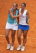 Sara Errani & Roberta Vinci recaptured their form in 2014, reclaiming the world no. 1 ranking.[7] They were able to reach three slams finals winning two of them, they were able to defend their Australian Open title defeating Russians Makarova & Vesnina and completed the career grand slam by winning Wimbledon over Babos& Mladenovic, thus becoming only the fifth pairing to complete the career grand slam.[8] They also reached the final of the French Open for the third time in a row but fell to the Asian pairing of Hsieh & Peng. The Italian duo also captured three more titles, the Mutua Madrid Open over the local pairing of Muguruza & Suárez Navarro, and at the Rogers Cup and Porsche Tennis Grand Prix both over Black & Mirza. They also reached two other finals but lost, at the Apia International Sydney to Babos & Šafářová and at the Internazionali BNL d'Italia to Peschke & Srebotnik.