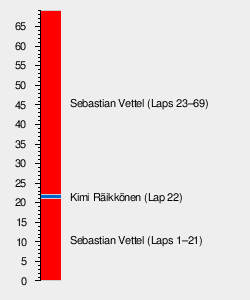 When Lewis Hamilton came into the pit lane on lap 20, he emerged slightly in front of Valtteri Bottas in fifth place. Rosberg made a pit stop for new tyres one lap later, choosing the harder medium compound. The two Ferrari drivers and Daniel Ricciardo followed in the subsequent lap, staying ahead of Rosberg and Hamilton respectively. Meanwhile, Romain Grosjean became the second Lotus driver to be penalised, receiving a five-second penalty for an unsafe release from his pit box.[27] Hamilton was behind Ricciardo in fifth place at this point, who was running the harder compound tyres, eventually passing him on lap 29. By lap 33, Vettel in front was leading teammate Räikkönen by seven seconds, with Rosberg a further twenty seconds adrift. Meanwhile, Hamilton started to gain on his teammate, setting fastest laps to trail him by eight seconds on lap 36.[26]