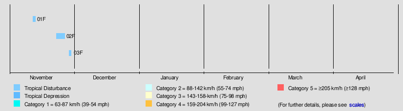 | 02F | November 23 – 27 | Tropical disturbance | Not Specified | 1006 hPa (29.71 inHg) | None | None | None | |