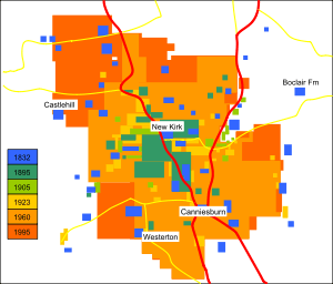 The graphic is a summary of maps of the area since 1832. These demonstrate the growth of the town to its current extent from a large number of disconnected dwellings to a large settlement spreading from the New Kirk area. The relative size of houses (and corresponding affluence of households) tends to increase with age, but this is not a strict rule.[25][26][27]