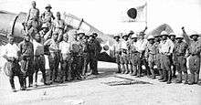 Group members and one of the last Curtiss P-40Es of the 24th Pursuit Group, taken at Bataan Airfield in early 1942 during the Battle of the Philippines (note Camouflage netting). | |